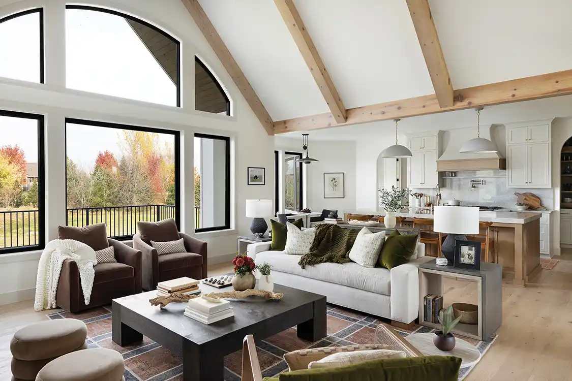 When the build and design teams learned that the clients enjoy entertaining, they knew that the home needed an open layout that encourages natural flow and connection between the primary hosting spaces: the kitchen, living room and dining room. “Across these distinct yet connected spaces we incorporated architectural ceiling beams that enhance the visual cohesiveness of each functional zone and are a nod to the charming look of the barn that is next to the house,” Gabriela explains.