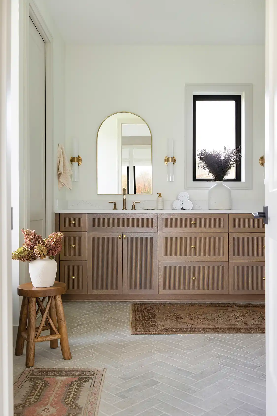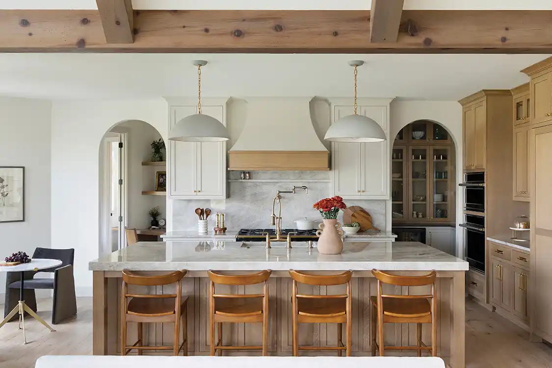 Gabriela gleaned much of her styling inspiration from the picturesque surroundings and combined it with her creative eye for design. “The rural landscape and the barn itself inspired the color palette and many of the natural materials seen throughout the home. Amy’s childhood home had some farmhouse design elements in it too, so there’s a personal nostalgic connection in the interior design,” she says. “The homeowners loved the organic Modern Farmhouse aesthetic because it balances warmth, texture and a clean, understated elegance. To achieve this for them, I curated a mix of natural materials, including wood beams, wide-plank flooring, custom white oak cabinetry and brass accents in furnishings. An earthy palette of soft whites, warm beiges and layered browns brought depth and cohesion to the interiors. Details like the kitchen’s Taj Mahal quartzite countertops and matching backsplash and natural cabinet finishes make the home feel grounded and beautifully composed.”