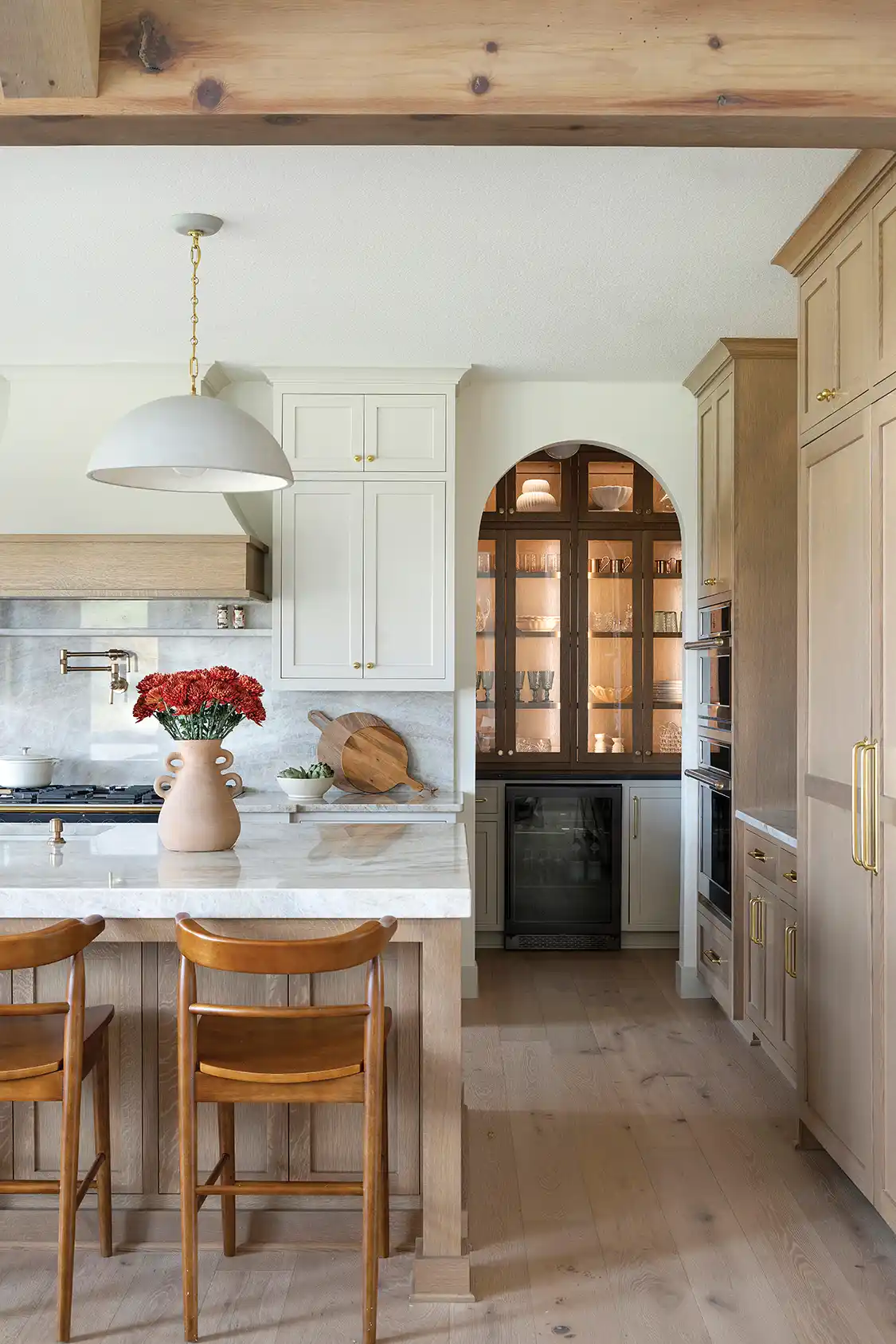 Gabriela also used her creativity to create stylish but compact storage areas. “I always ensure my designs include integrated storage for household essentials,” she says. “In this kitchen, the wall of quarter-sawn white oak cabinetry with aged brass pulls includes a hidden double fridge and double oven. Next to the built-ins, an arched doorway leads to the prep pantry with a glass-paned dish cabinet, which is ideal for staging, storage and showcasing the family’s dishware collection.”