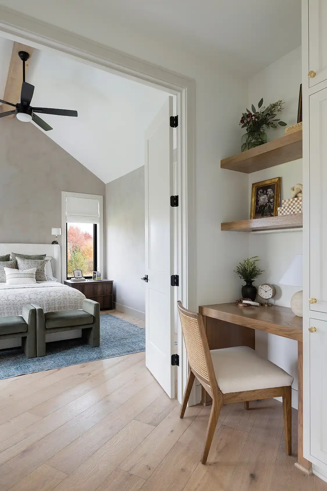 As with all successful room designs, the color palette played a pivotal role. “For an organic look inspired by the rural landscape, I chose a palette of earthy tones like espresso, cream and moss,” Gabriela says. “In the primary suite, we leaned into olive tones through the bedding and the end-of-bed ottomans, similar to the accents found in the living room accessories. Trevin’s office was color-drenched in a dramatic gray with subtle blue undertones for a more moody, masculine feel.”