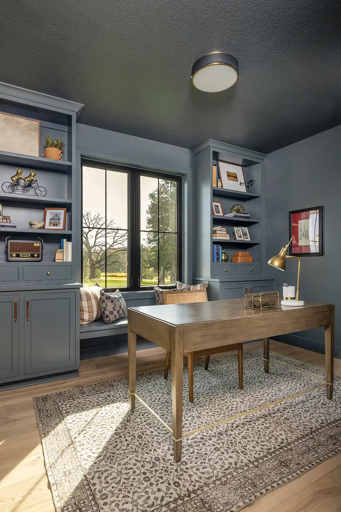 - Don’t be afraid to go in a creative design direction. For example, in this home we color-drenched the office in a dark blue. While this technique is a bit unusual for a farmhouse-style home, the timeless color and built-in shelving make this fit seamlessly with the rest of the home’s design.
