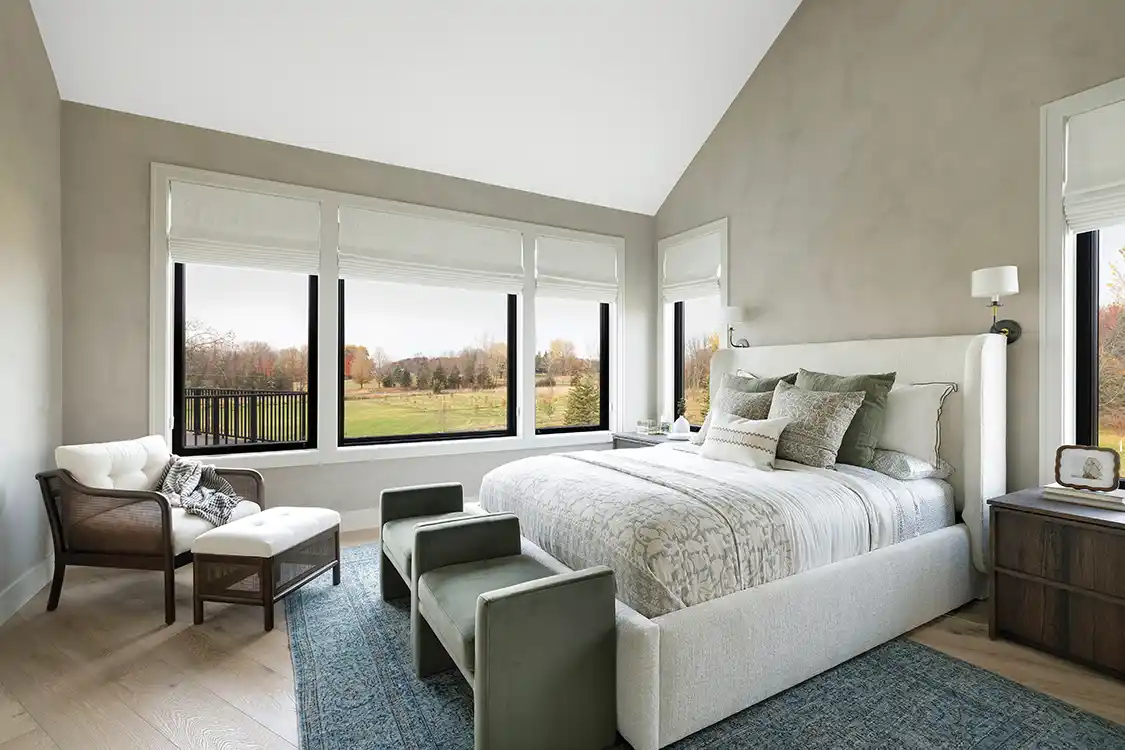 The primary bedroom features many of the essential elements associated with Modern Farmhouse Style. “There are many traditional features in the primary bedroom, including a vaulted ceiling and walls finished in gray lime wash for more visual texture,” Gabriela says. “The bedroom design has a relaxing sense of order through symmetry, with matching elongated windows, solid acacia nightstands and aged brass sconces on either side of the bed. I selected botanical print bedding and sage accents to connect to the surrounding farmland, visible through large windows and other accents throughout the home. The traditional wingback headboard is upholstered in cream bouclé. I also hid the TV above the double doors to preserve the refined aesthetic.”