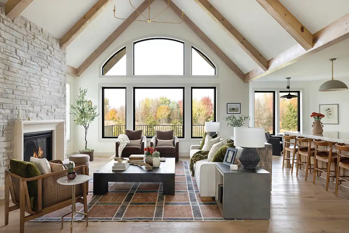 When the build and design teams learned that the clients enjoy entertaining, they knew that the home needed an open layout that encourages natural flow and connection between the primary hosting spaces: the kitchen, living room and dining room. “Across these distinct yet connected spaces we incorporated architectural ceiling beams that enhance the visual cohesiveness of each functional zone and are a nod to the charming look of the barn that is next to the house,” Gabriela explains.
