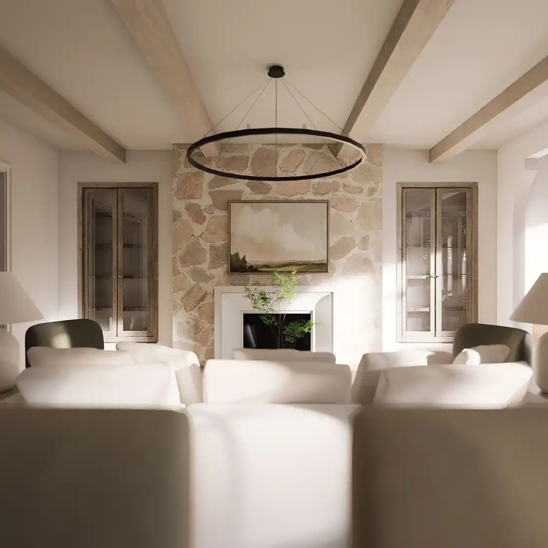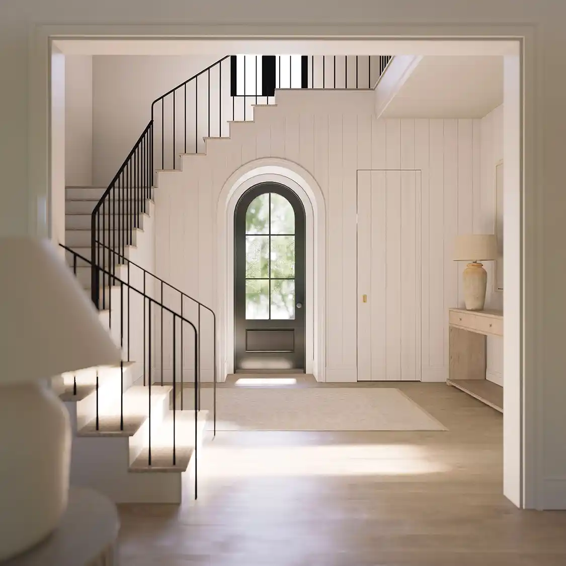 When planning an open staircase, think of it as a design feature rather than just a functional element. Keep the lines clean to preserve sightlines and choose materials that complement the rest of your home’s palette. We are using white oak treads paired with slim iron railings for a modern-meets-classic look. An open stairwell also benefits from layered lighting: wall sconces, a statement chandelier, and, if possible, a large window to flood the staircase with natural light.