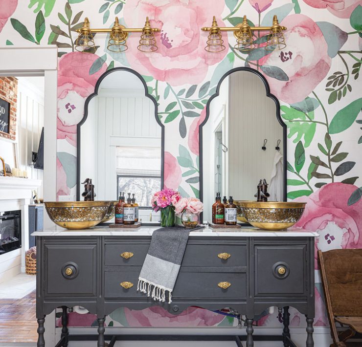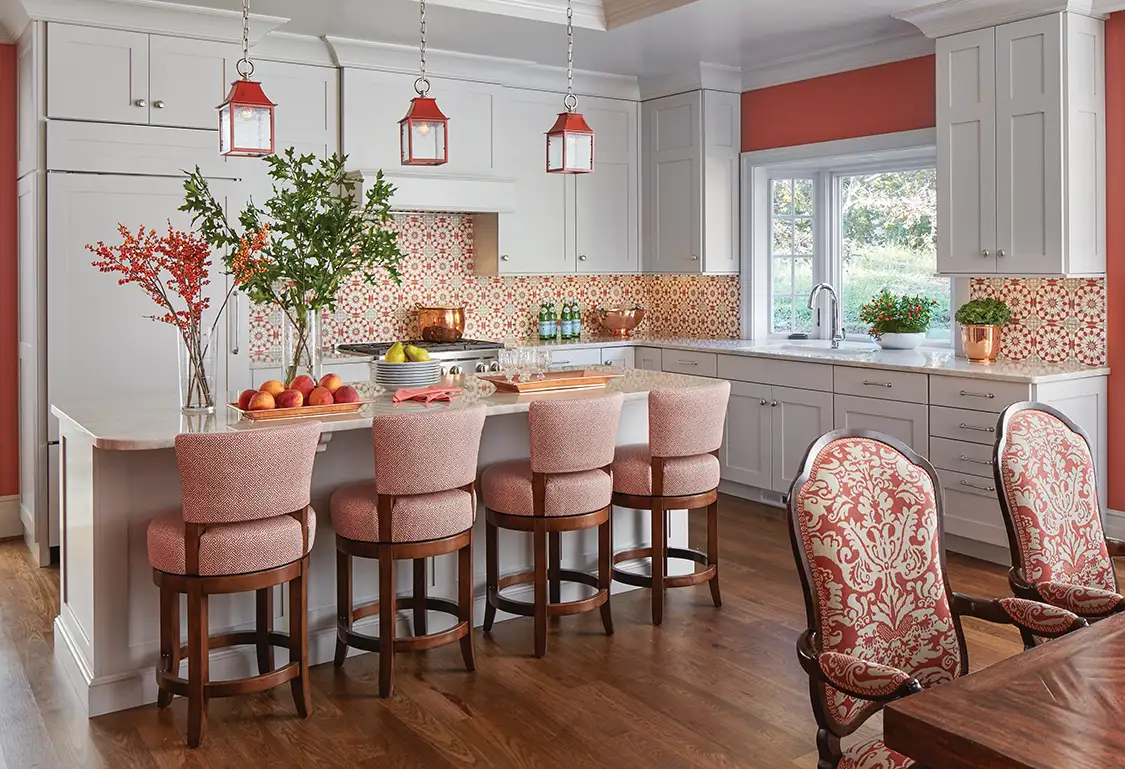 Coral may not be the first color that comes to mind when designing a kitchen, but the family of this lake house wanted a vibrant hub where the husband could cook, entertain and enjoy everyone’s company. Designer Elizabeth Drake honored these goals, designing the layout to be appetizer- and conversation-friendly, while strategically incorporating the color without overpowering the space. Using a mix of coral accents through tile, textiles, lighting and wall color, Drake balanced the bold hue with soft, off-white cabinetry and copper accents to keep it cheery, layered and lake-house friendly.