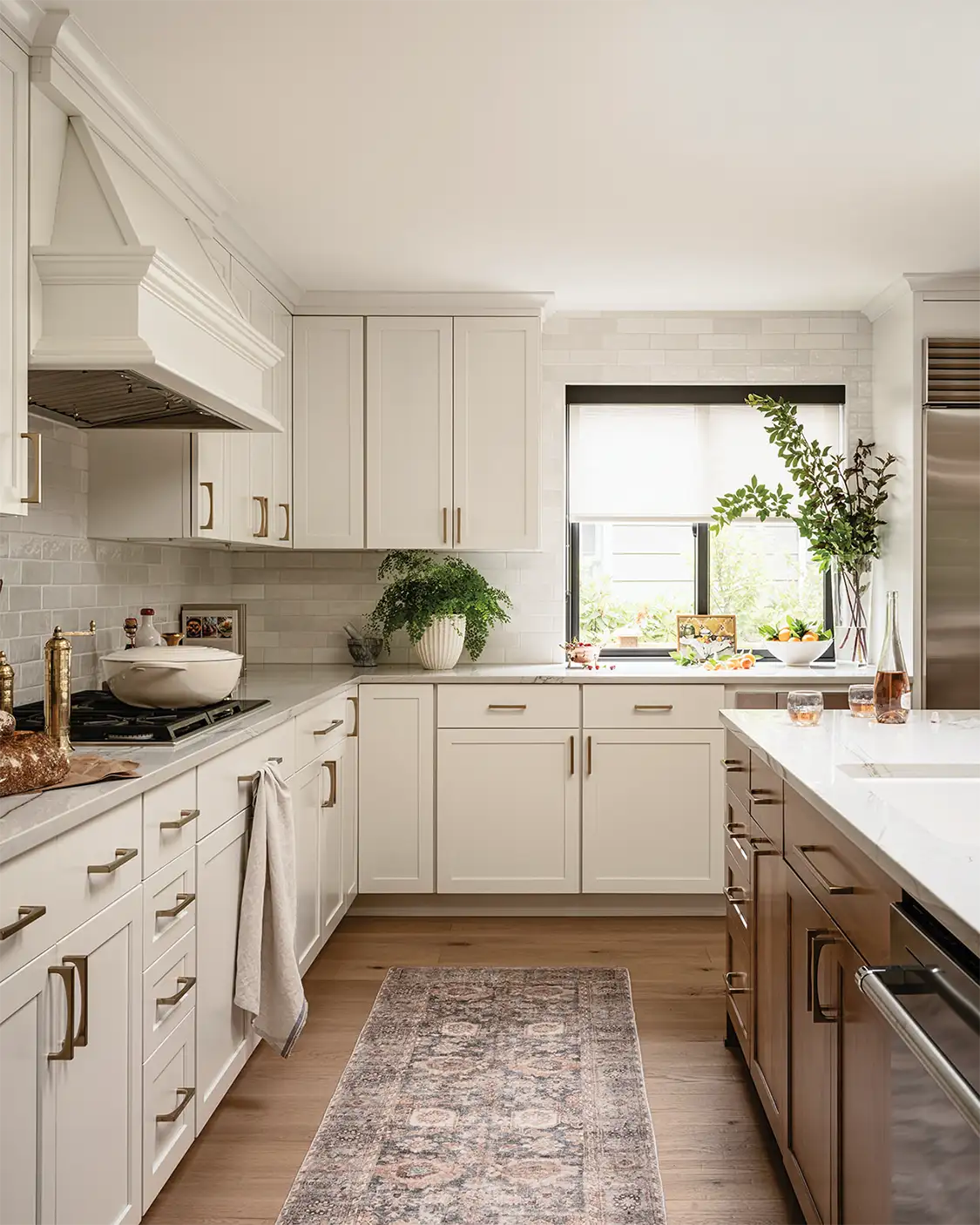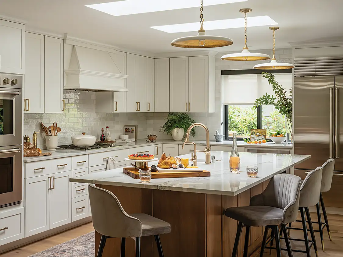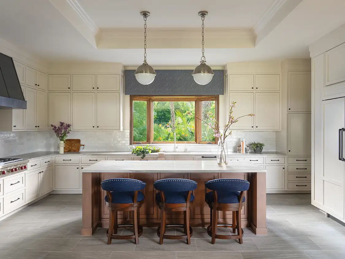 The goal for this San Diego kitchen remodel was clear: transform a dark and heavy space into a bright, fresh and charming area —without construction. Instead, designer Andrea Lackie replaced the outdated Roman shades and a heavy wood cornice on the room’s main window to instantly bring in more light and then repainted all cabinetry a warm and welcoming not-quite-white. “For continuity, a darker stain for the island was chosen to tie into the existing windows and add contrast to the surrounding kitchen cabinetry,” Andrea says, whose team enhanced the kitchen with sleek natural stone quartzite countertops and added a rich texture of sandcast bronze cabinet hardware.