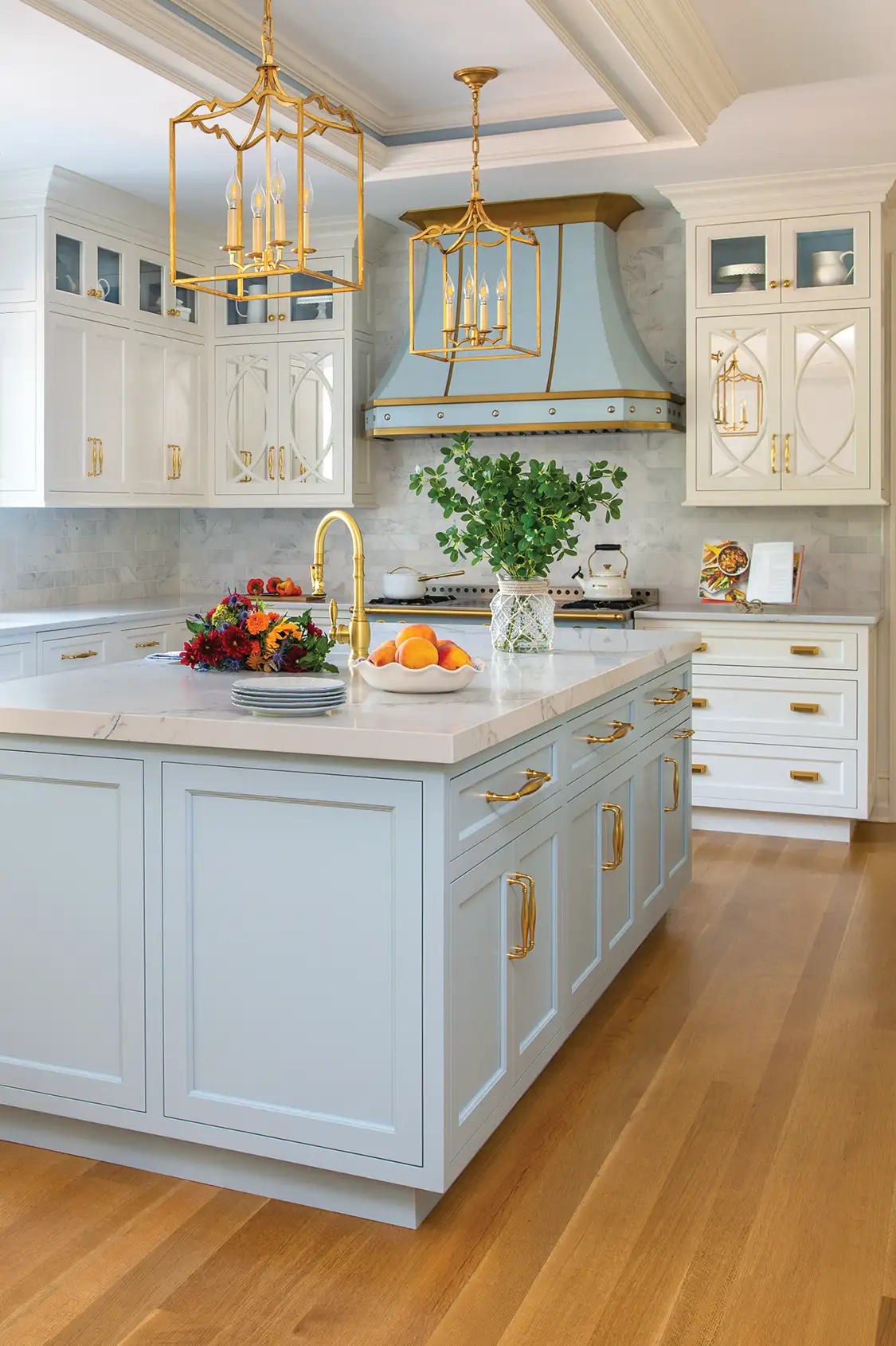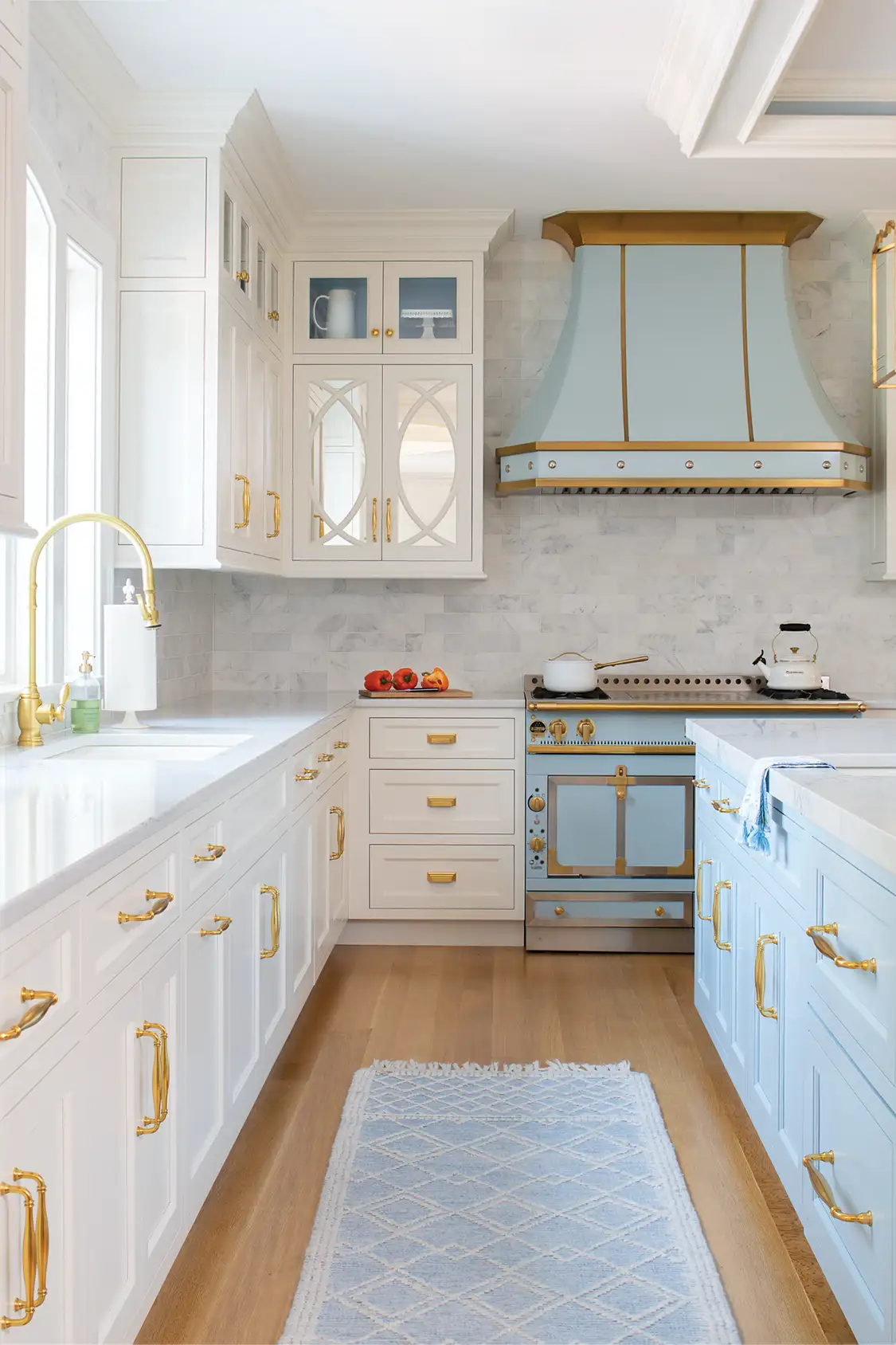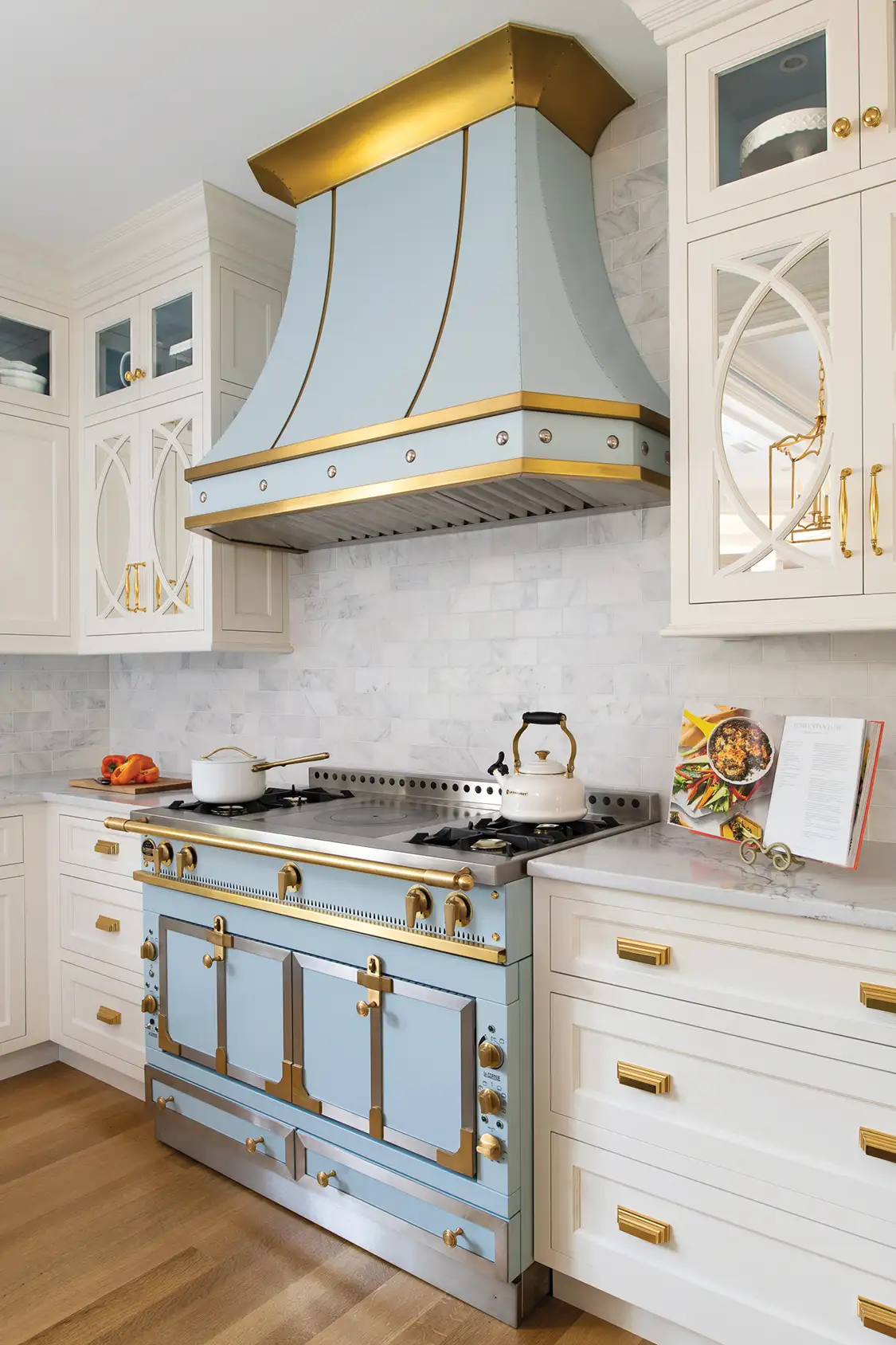 A baby blue range creates a captivating kitchen focal point.