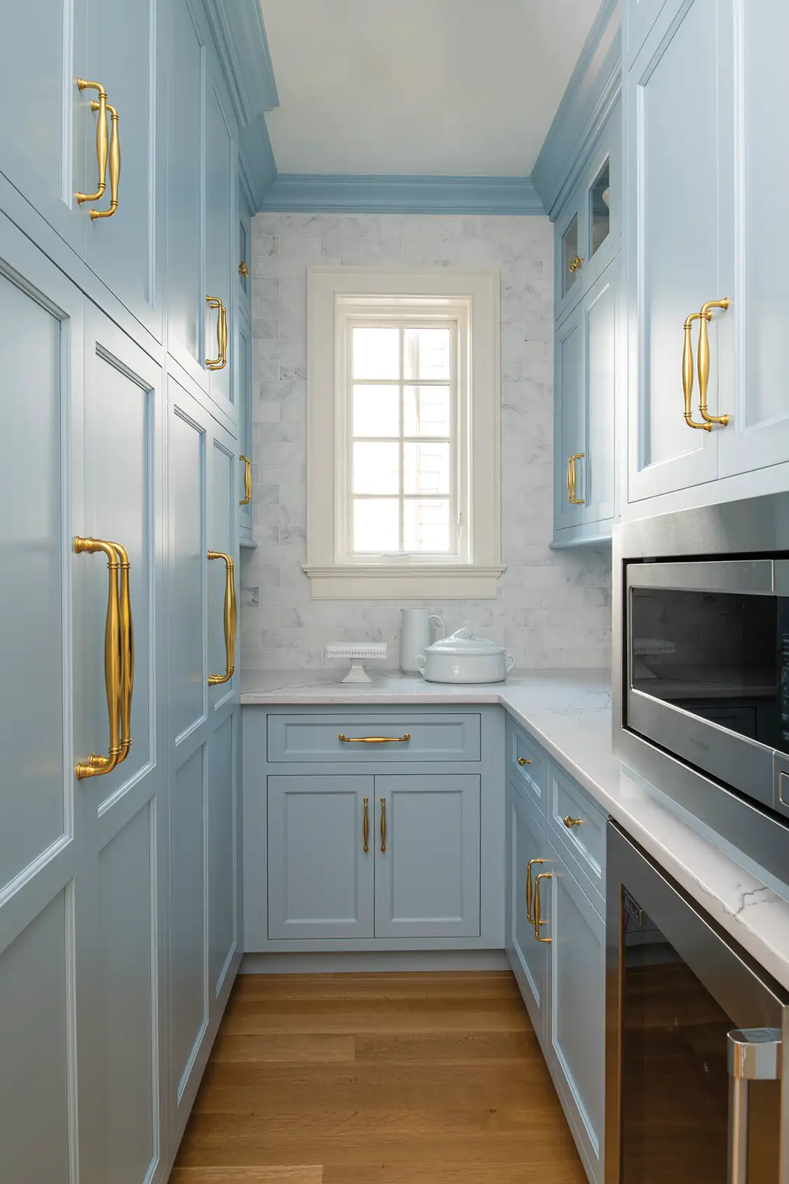 Honoring traditional architecture while taking the occasional design risk is what designer Suzette Donleavy does best, and this kitchen gave her ample opportunity to highlight delicate balancing acts. Here she designed a “lighter, brighter, more transitional space that addressed entertaining flow while in keeping with the traditional design of a Shore Colonial home,” Suzette says. The range is the hands-down showstopper, setting the tone for the entire design. “A La Cornue range in Suzanne Kasler’s Roquefort blue inspired the initial design, and the homeowner’s desire to incorporate a culinary star,” Suzette says. She extended the color inside the glass cabinets, where the same shade of blue is used, to provide a colorful canvas for the homeowner’s prized ironstone collection.