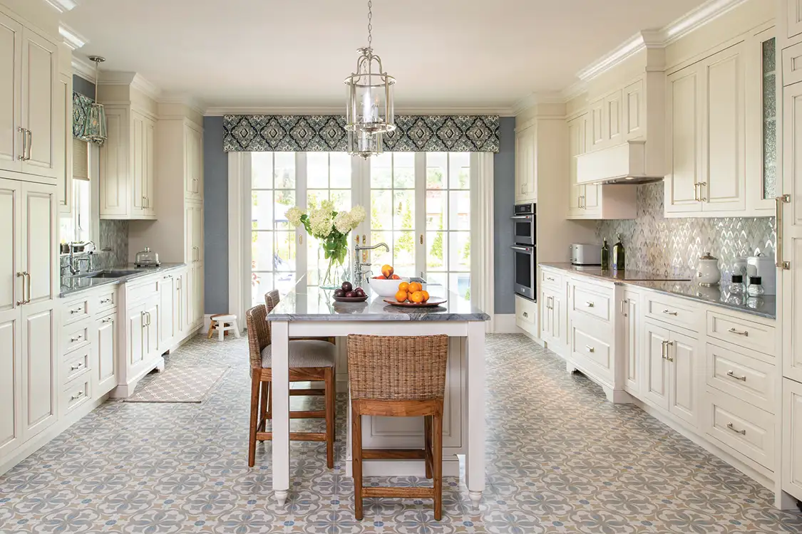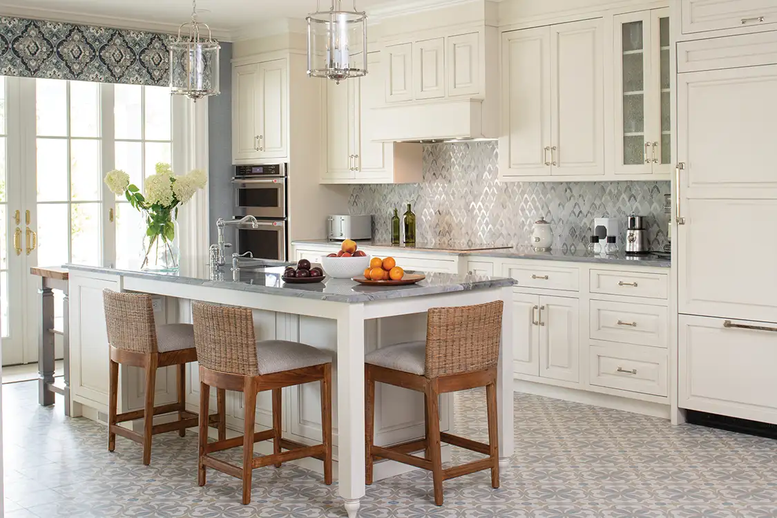 McNeil, founder of Anne Rae Design, went big for her clients who love to cook and gather in the kitchen with a 60” BlueStar professional range. And yet the project isn’t only about brand-new appliances; the client also wanted to highlight her extensive collection of Polish pottery. Using Tabarka Studio tiles for the backsplash, Kristin was able to integrate a hand-painted, timeless element that creates an Old World counterbalance to the state-of-the-art appliances: “By merging European refinement with natural elements, the space feels effortless and welcoming,” Kristin says.