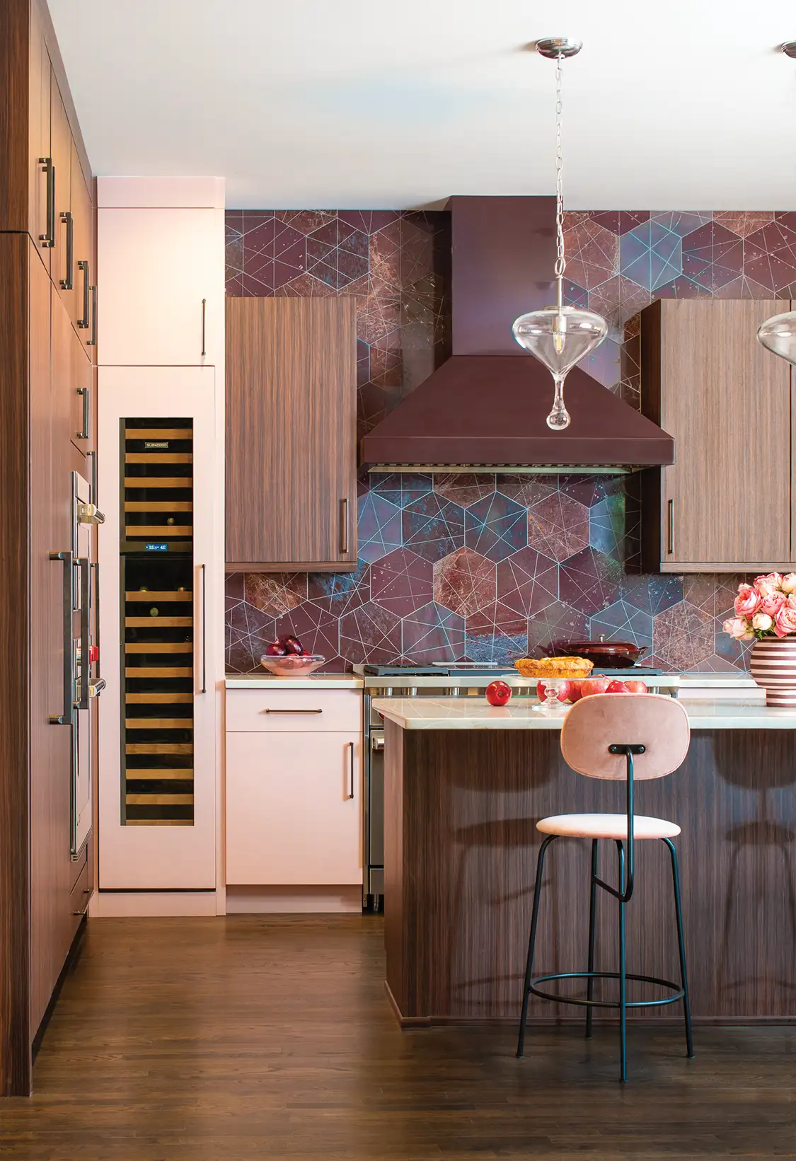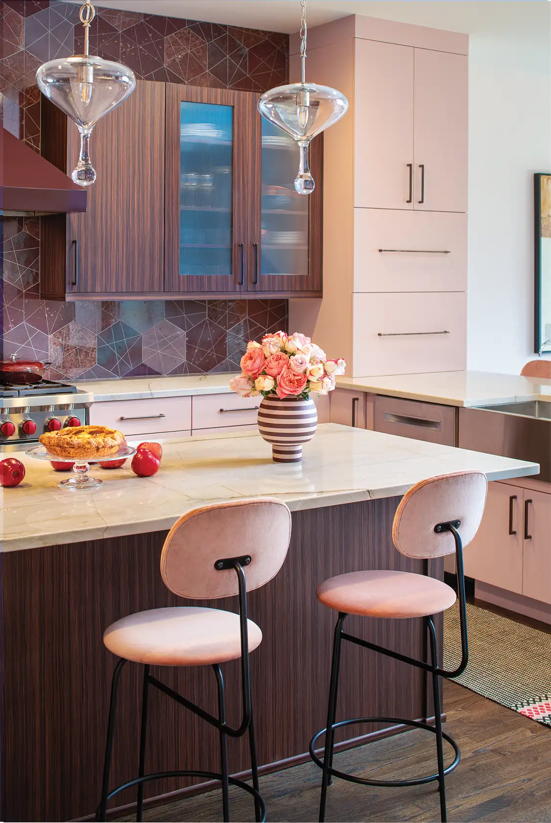 Personality, confidence, and color were all on the client’s wish list for her dream kitchen. “I saw her as free, independent and a bit of a rock star,” interior designer James Yarosh says. “She is truly comfortable in her own skin, and this served as a jumping-off point for the design journey.” James took his clients’ must-haves and crafted a one-of-a-kind culinary hub starring a palette of pinks and purples that includes petal-hued cabinets, Afteroom stool custom covered in JAB Anstoetz Fabrics and, most strikingly, the can’t-miss geometric backsplash tile sourced from Studium. The natural grain of the rosewood cabinets adds depth, while modern bronze accents and soft blush tones redefine neutrals, crafting a serene and inviting space for cooking and entertaining.