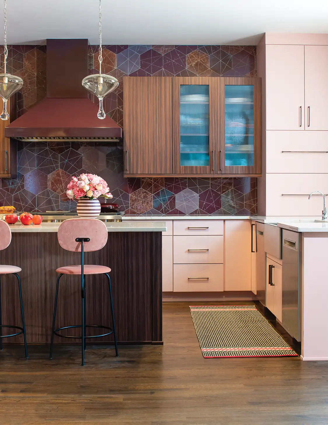A statement-making kitchen leans into a palette of pinks.