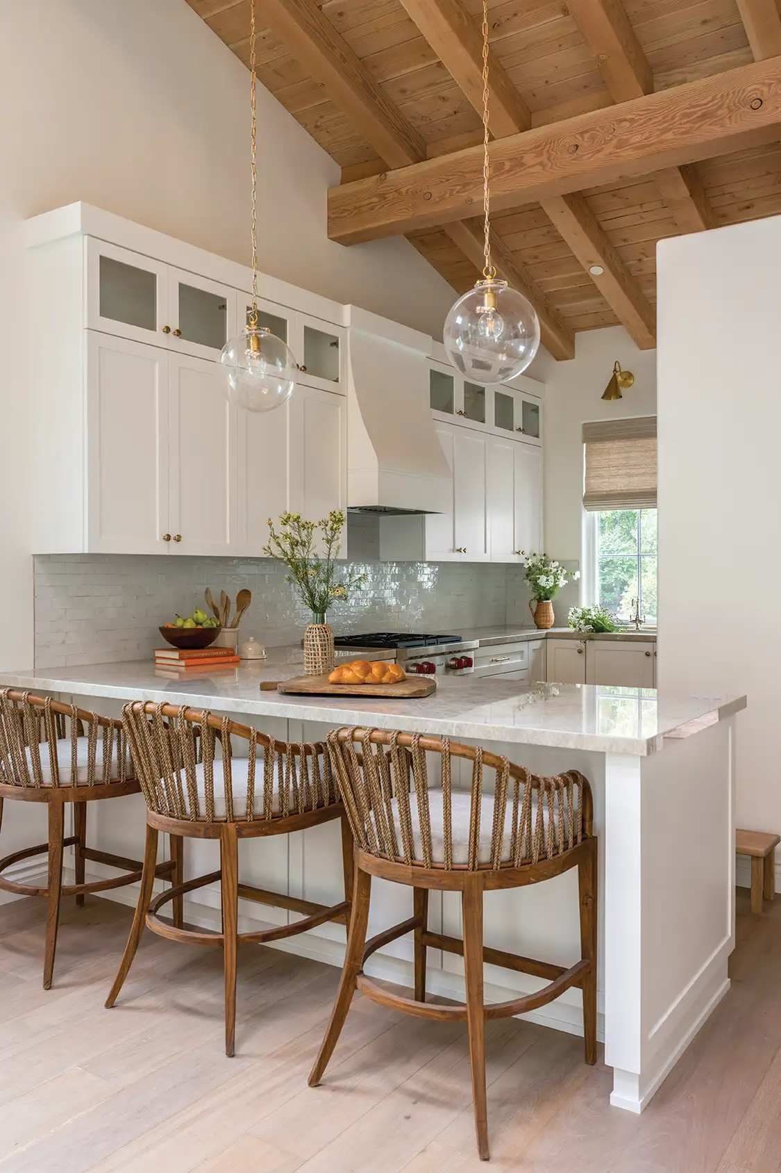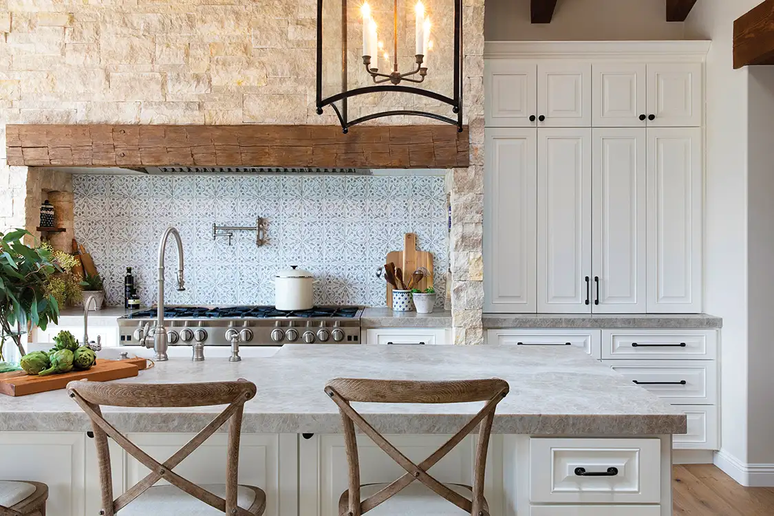 For this San Diego guest house, designer Katelyn De Spain of Makehouse Design Studio wanted to create a full-size kitchen experience within a much smaller footprint. “Our vision was to create a guest house retreat that had all the bells and whistles of our client’s main residence, mirroring a mix of Southern California-Mediterranean style,” Katelyn says. Using full-size appliances and generous storage, the kitchen is tailor-made to ensure guests have main-house comfort. Katelyn also wanted to echo the primary home’s timeless feel, so she used wood beam ceilings sandblasted two times to achieve an aged, reclaimed look, adding, “It