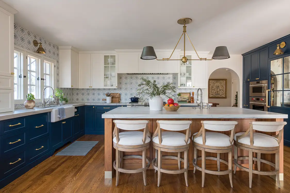 When your clients are a Culinary Institute of American-trained chef and a French-born son of a bistro-owning family, the standards are going to be high. To create the kind of space that would complement her clients’ culinary skills and aesthetic vision, designer Kristin Kostamo-McNeil, founder of Anne Rae Design, created a one-of-a-kind menu that includes French café details with classic California elements, all while integrating everything a serious home chef could want. “With a mix of historic details and French-inspired accents, this charming bungalow is brimming with style,” Kristin says. The island is highlighted by a double light Urban Electric pendant, while hand-painted blue-and-white terra cotta backsplash tiles from Tabarka Studio complement the navy base cabinets. The true spotlight stealer, though, is the Dacor refrigerator. “I designed it to resemble a built-in armoire with a custom antique mirrored and paneled front,” Kristin says. “It steals the spotlight and never fails to captivate guests once they discover its true identity.”