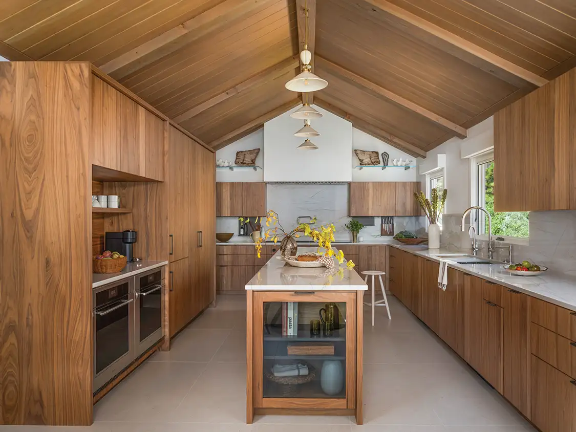 How to connect a modern kitchen with a traditional home? That was the question when designer Andrea Lackie was brought on midway through this extensive Lake Tahoe renovation. With ultra-streamlined Henrybuilt walnut cabinets, the kitchen needed a visual connection to the neighboring rooms in this 1940s cabin. She found the key to the challenge above: Andrea designed a stained cedar ceiling, developed with Sawtooth Builders, to connect the rooms and dissolve their design differences. “We used cedar tongue and groove on the ceiling and added shallow beams to reference the existing living room ceiling, which was wood with large wood trusses,” Andrea says.