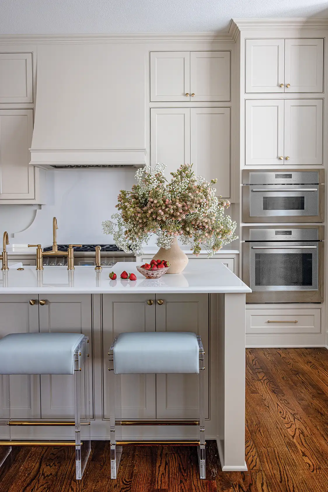When you’re designing a home for four small children and one very busy single mom, the kitchen holds zero room for error. That was the case when Dallas-based interior designer Sarah Hargrave was enlisted to fully reimagine the space. “We aimed to refresh outdated cabinetry, appliances, and finishes along with creating intentional storage and beauty,” Sarah says. Sherwin Williams’ “Natural Tan” was chosen for the cabinetry to highlight the rich tones of the countertops and avoid a stark white palette. New Thermador Professional appliances and Brizo plumbing fittings were selected for their high quality and sleek design. The quartz countertops, with their covered edges, add sophistication, while kid-friendly counter stools with faux leather upholstery offer style, durability and freedom from worrying about stains.