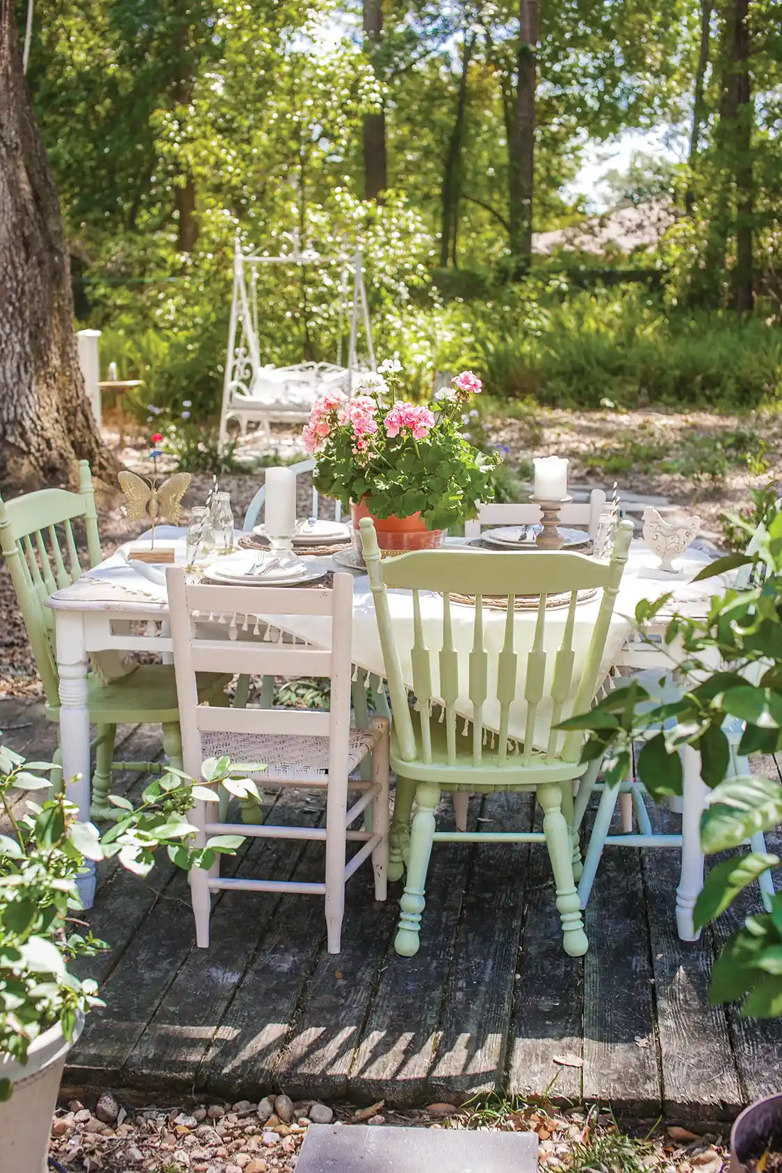The old oak tree at the front of the property is a classic for the south, with Spanish moss dripping from its branches. “When I saw this house, the thing I loved the most was the large oak tree that frames the house,” Scarlett says. “It’s such a romantic, old-fashioned tree style. Our area is historic and has these trees you drive under with the Spanish moss hanging down. We have another huge one behind the house.”