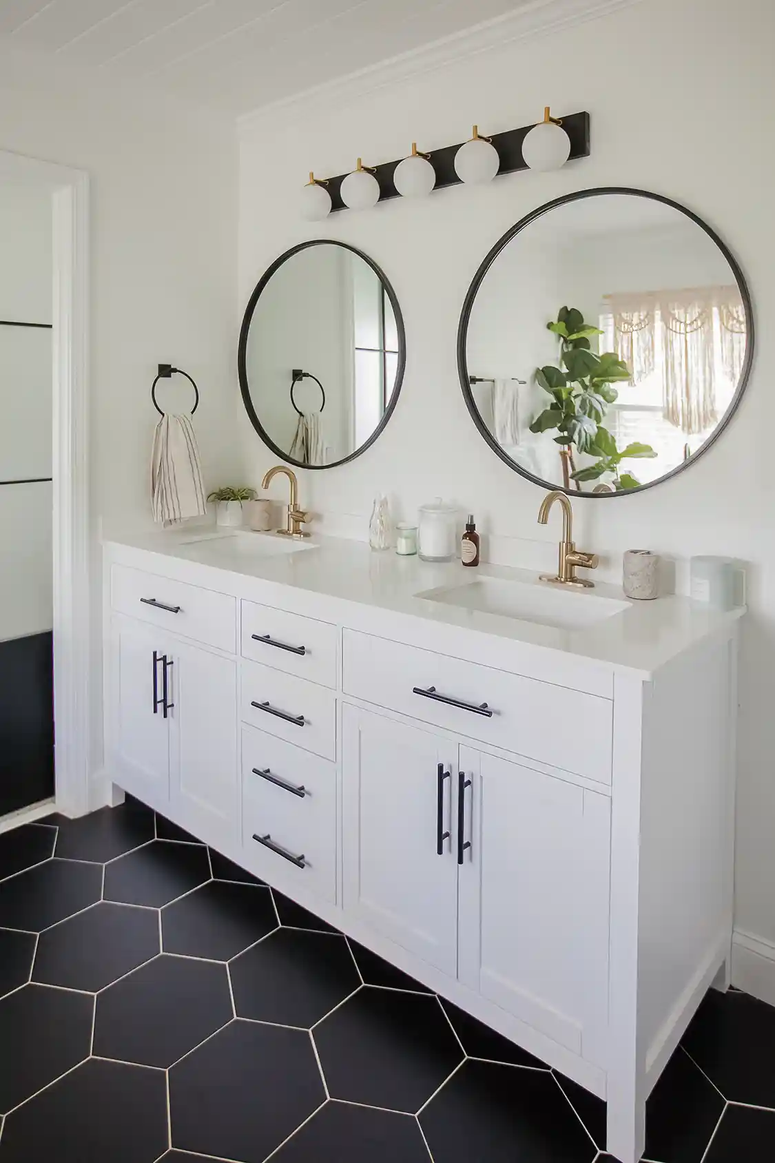 While Scarlett insists she and Stephen aren’t handy, they’ve done quite a few DIY projects since moving in 2021, including installing bathroom vanities, lighting, faucets, wall paneling, and of course, painting. “In my childhood, I wanted to be an architect, and I’ve always had a passion for design,” Scarlett says. “So it came full circle. My husband and I are not naturally handy, but my husband jokes that I can learn anything from YouTube University.”